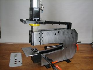 C frames grote uitlading. Is max. 350mm. Schakelkast pons. Breedte van ponsblok is 110mm. Opleghoogte tot tafel is 205mm. Vrije doorvoer hoogte 60mm. Kan maximaal door 2mm plaat ponsen. Werkt op 6 bar luchtdruk. Totale machine gewicht 130 Kg. Voor onze standaard c frame die geschikt zijn voor de standaard ponsbeugels. kijk hier voor onze c frame persen.